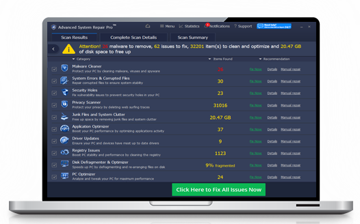 With a simple 1-click, Advanced System Repair speeds up your PC by assembling fragmented files on your machine and organizing them more efficiently.